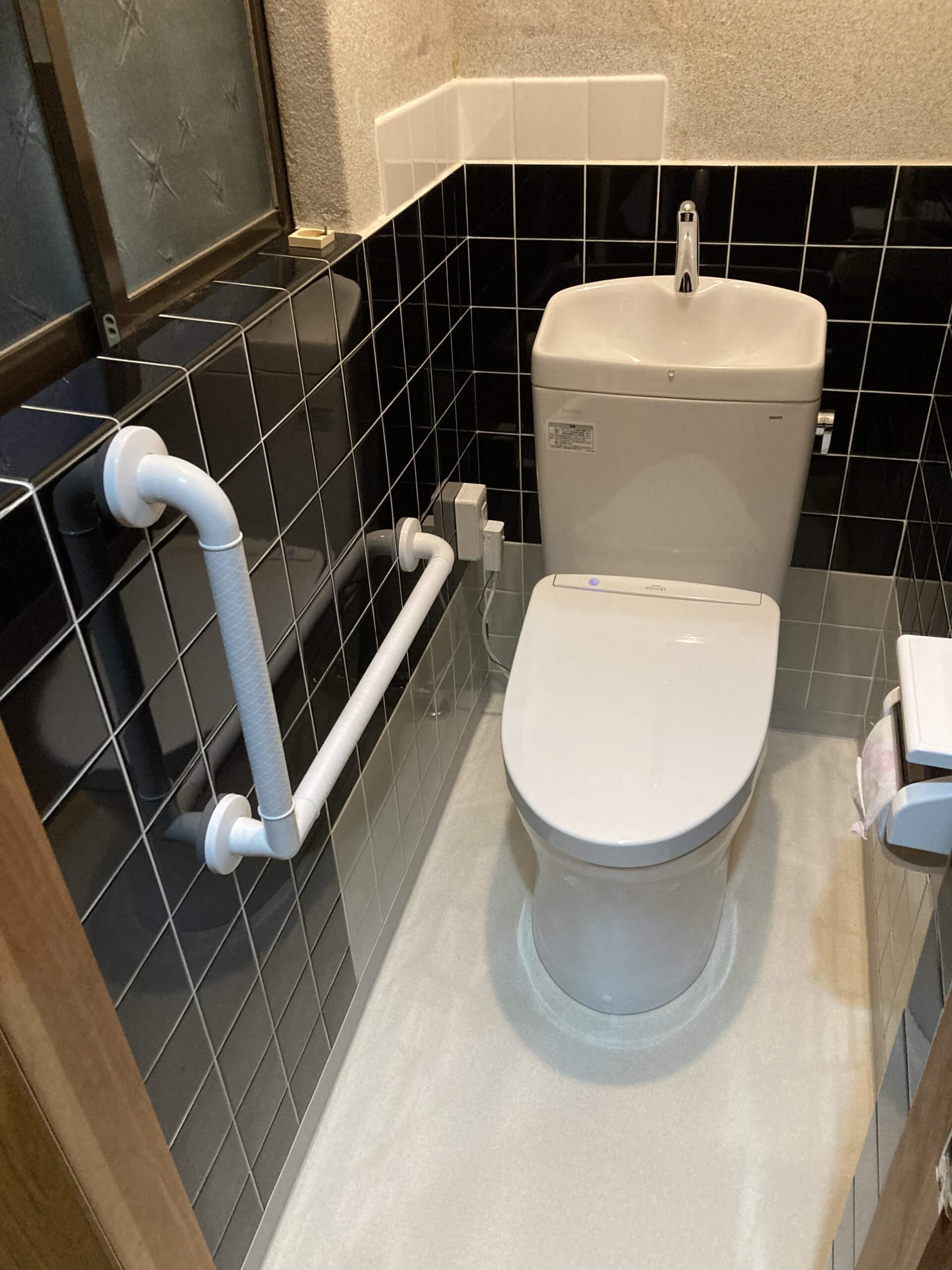 介護保険制度を利用しての施工。脳梗塞発症で入院され、汽車式でのトイレは転倒リスクが大きく、改修工事をすることになりました。改修後は、立ち座りが楽になったことと、自動洗浄になったことで、トイレ内での方向転換が減り、動きやすくなったそうです。ご家族からも、床材をタイルから長尺シートに変更したことで、お手入れが楽(私は掃除が好きではないので)と言ってもらいました。