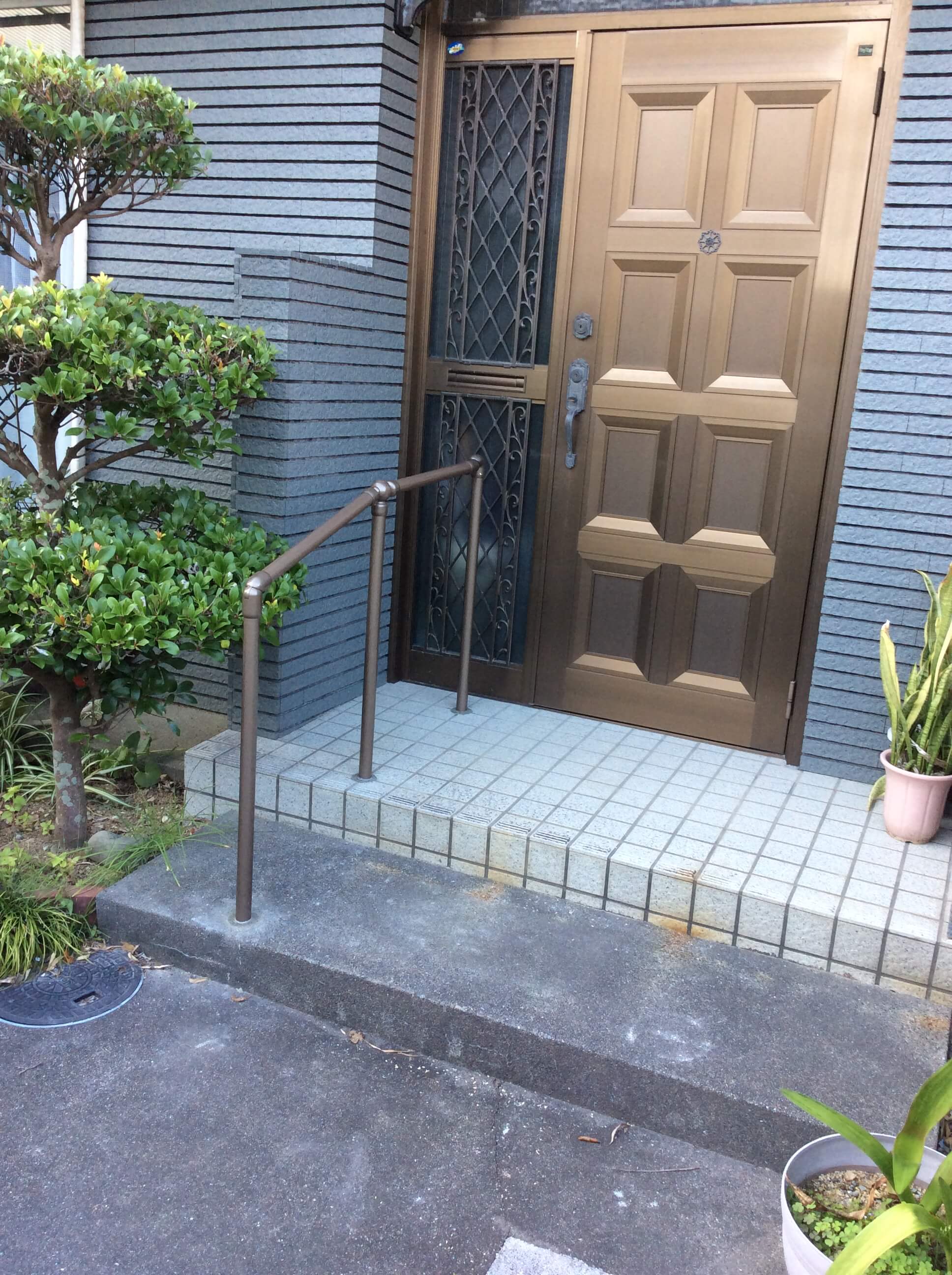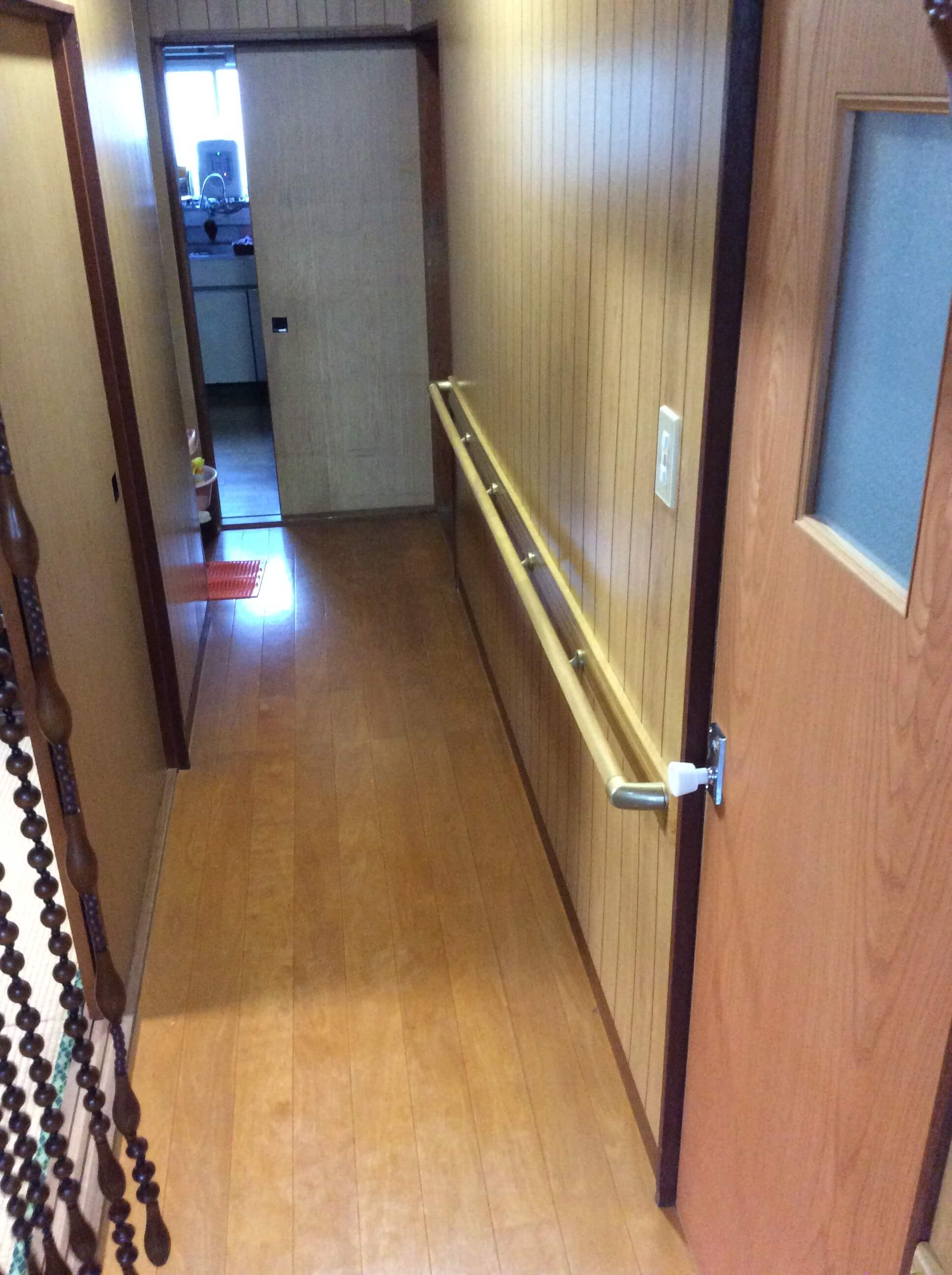 外出する際、玄関と玄関ポーチの昇り降りに危険を感じ始め、手すりを取付けました。また、今まで掴まるものがなかった廊下に手すりを取付けることで浴室、トイレへの移動がスムーズになり転倒への不安も解消できました。